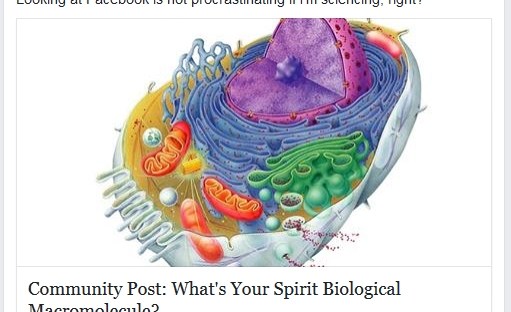 So a friend tagged me on Facebook with a "What's your spirit biological macromolecule quiz?" from Buzzfeed. (I'm collagen, thanks for asking.) The questions were ridiculous and silly, but I thought--what a great idea! I can see getting kids to write quizzes... What step of photosynthesis are you? (Are you the sort to have your … Continue reading Buzzfeed Biology (and other sciences)