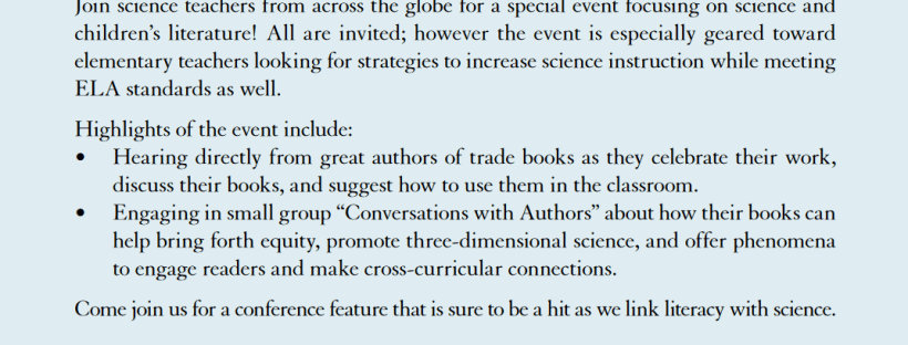(With apologies to Judy Garland) The National Science Teachers Association (NSTA) will have its annual conference in St. Louis, MO from April 11 to 14. Of course, the national conference is always a fantastic experience. This year, a whole slew of children’s science writers are going to converge on the conference and have a special … Continue reading Meet Me in St. Louis